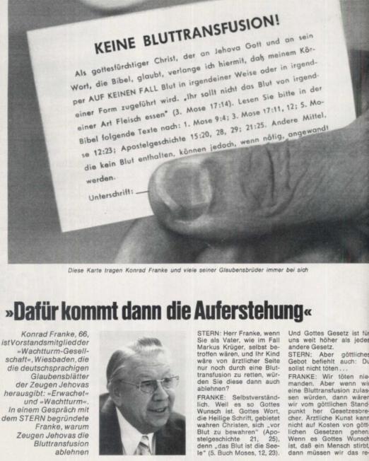 Diese Fakten aus Gottes Wort muss man bei der Betrachtung dieses Themas ernst nehmen. Dazu kommt noch eine andere Frage, wer hat überhaupt diese weltweite Diskusion über Bluttransfusion begonnen? Das sind die Leitenden der Zeugen Jehovas, die in Brooklyn die Obersten sind. Was sind das für Leute? Das sind die, welche dreimal, in den Jahren 1914, 1925 und 1975, dass das Königreich auf Gottes auf die Erde gekommen sei, verkündigt haben... Das sind diejenigen, welche Gesetzlos sind und dadurch in Sünde leben... Das sind diejenigen, welche jahrelang Weihnachten gefeiert haben und den Gläubigen erlaubt haben am 1. Weltkrieg teil zu nehmen... Das sind diejenigen, welche auf die Anfrage der deutschen Zeugen Jehovas in der Hitlerzeit geboten haben, weiterhin von Haus zu Haus zu gehen und ihr Werbematerial, den Wachturm, zu verbreiten... Obwohl der wahre Gott Jahweh den Zeugen Johovas diesen Auftrag nie gegeben hat!... Das sind diejenigen, welche eine Bibelverfälschung inform einer eigenen Bibelübersetzung gemacht haben... Das sind diejenigen, welche sich als Gesalbte Gottes und Gottes einziger Kanal auf der Erde bezeichnen...